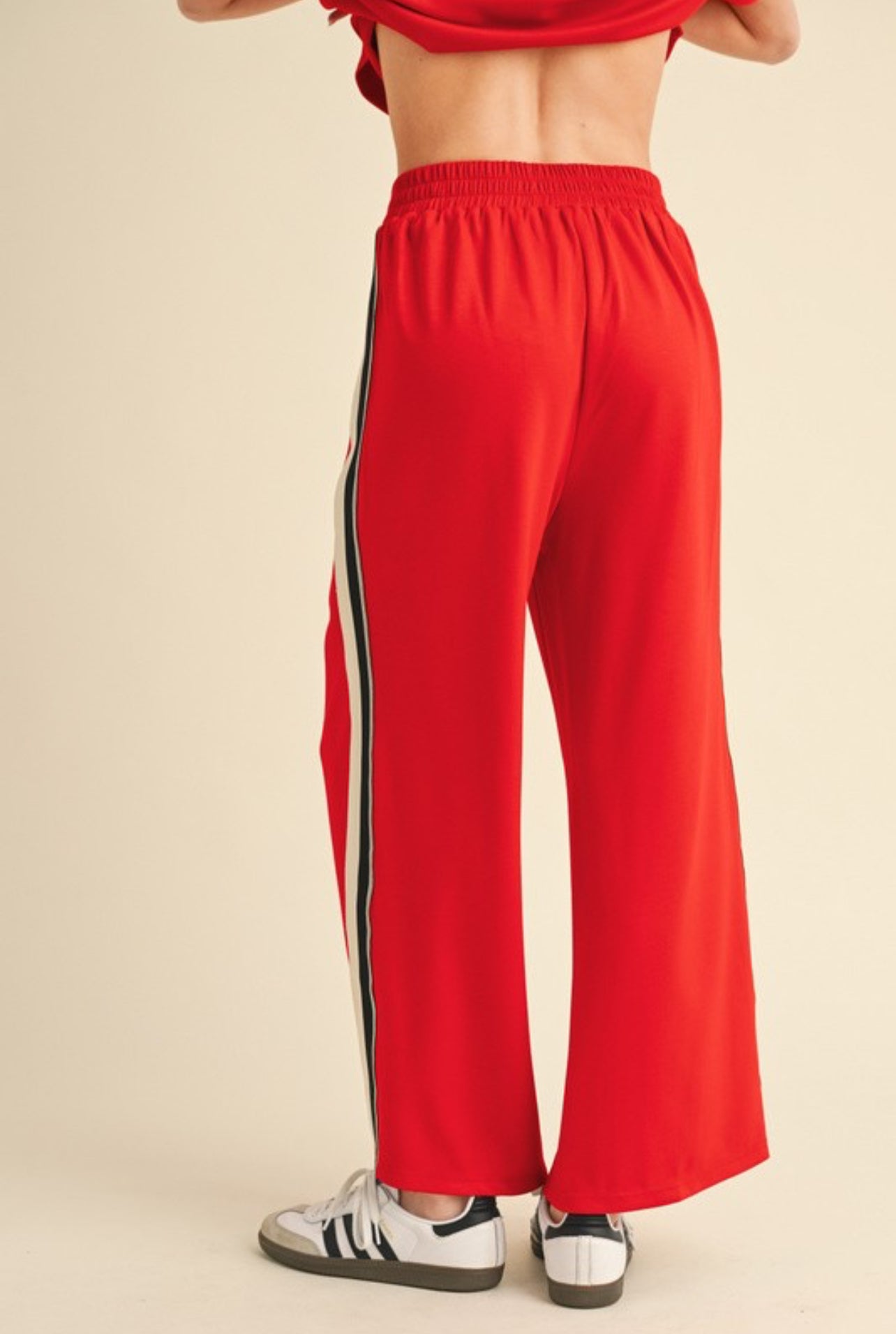 50% RAYON 45% POLYESTER 5% SPANDEX TRACK PANTS, SUPER CUTE PAIRED WITH A GRAPHIC TEE